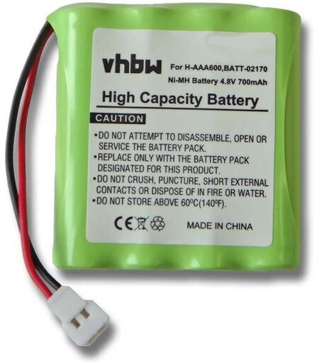 vhbw - the clever way - Batterie de rechange de haute qualité avec une grande autonomie et compatible avec votre babyphone (vous trouverez ci-dessous tous les modèles correspondants) - La batterie peut être chargée avec le chargeur standard ou un chargeur compatible - Nos batteries répondent à toutes les normes de sécurité actuelles CONTENU DE LIVRAISON : - 1x batterie DONNÉES TECHNIQUES : - Technologie : NiMH - Capacité : 700 mAh - Tension : 4,8 V - Énergie nominale : 3,36 Wh - Couleur : vert COMPATIBLE AVEC Summer Infant 02174, 02170, 02170 Video Monitor, 02174 Video Monitor Pour garantir la compatibilité, veuillez vérifier si votre batterie utilisée actuellement est répertoriée. REMPLACEMENT POUR : - H-AAA600, BATT-02170 vhbw - Accessoires et pièces de rechange de haute qualité pour prolonger la durée de vie de vos appareils électriques. ...