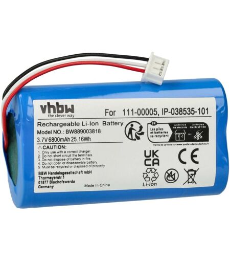 vhbw - the clever way - Batterie de rechange de haute qualité avec une grande autonomie et compatible avec vos hauts-parleurs et enceinte Bluetooth ou boxe portative (vous trouverez ci-dessous tous les modèles correspondants) - La batterie peut être chargée avec le chargeur standard ou un chargeur compatible - Nos batteries répondent à toutes les normes de sécurité actuelles CONTENU DE LIVRAISON : - 1x batterie DONNÉES TECHNIQUES : - Technologie : Li-ion - sans effet mémoire - Capacité : 6800 mAh - Tension : 3,7 V - Énergie nominale : 25,16 Wh - Nombre de cellules : 2 - Poids : 95 g - Dimensions (L x l x H) : 6,6 x 3,7 x 2 cm - Longueur du câble : 6 cm - Connexion : 1x connecteur JST à 3 broches Pour garantir la compatibilité, veuillez vérifier si votre batterie utilisée actuellement est répertoriée. REMPLACEMENT POUR : - Sonos IP-038535-101, 111-00005 vhbw - Accessoires et pièces de rechange de haute qualité pour prolonger la durée de vie de vos appareils électriques. ...