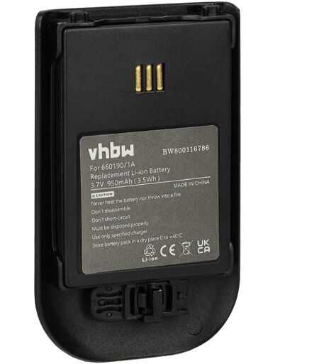 vhbw - the clever way - Batterie de rechange de haute qualité avec une grande autonomie et compatible avec votre téléphone (vous trouverez ci-dessous tous les modèles correspondants) - La batterie peut être chargée avec le chargeur standard ou un chargeur compatible - Nos batteries répondent à toutes les normes de sécurité actuelles CONTENU DE LIVRAISON : - 1x batterie DONNÉES TECHNIQUES : - Technologie : Li-ion - sans effet mémoire - Capacité : 930 mAh - Tension : 3,7 V - Énergie nominale : 3,44 Wh - Couleur : noir - Nombre de cellules : 1 Pour garantir la compatibilité, veuillez vérifier si votre batterie utilisée actuellement est répertoriée. REMPLACEMENT POUR : - Ascom RB-D62-L, 9D62 vhbw - Accessoires et pièces de rechange de haute qualité pour prolonger la durée de vie de vos appareils électriques. ...