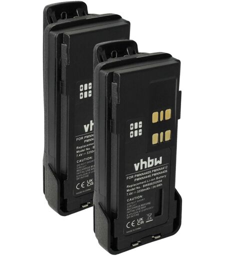 vhbw - the clever way - Batterie de rechange de haute qualité avec une grande autonomie et compatible avec votre radio talkie-walkie (vous trouverez ci-dessous tous les modèles correspondants) - La batterie peut être chargée avec le chargeur standard ou un chargeur compatible - Du fait de cette grande capacité, un autre boîtier de protection est nécessaire - celui-ci est bien entendu inclus dans la livraison - Nos batteries répondent à toutes les normes de sécurité actuelles CONTENU DE LIVRAISON : - 2x batterie avec couvercle de fermeture (couleur : noir) avec clip de ceinture détachable DONNÉES TECHNIQUES : - Technologie : Li-ion - sans effet mémoire - Capacité : 3350 mAh - Tension : 7,4 V - Énergie nominale : 24,79 Wh - Couleur de la couvercle : noir - Nombre de cellules : 2 - Matériau : plastique - Poids : 148 g - Dimensions (L x l x H): 11,4 x 5,5 x 2,3 cm - Couvercle arrière du boîtier inclus - avec clip de ceinture détachable - Contacts plaqués or COMPATIBLE AVEC Motorola P8608, GP328D, P8668i, TRBO, P8660 Pour garantir la compatibilité, veuillez vérifier si votre batterie utilisée actuellement est répertoriée. REMPLACEMENT POUR : - PMNN4406, PMNN4406BR, PMNN4409, PMNN4409AR, PMNN4409BR, PMNN4412, PMNN4448, PMNN4489A, PMNN4490, PMNN4490A, PMNN4490B, PMNN4491, PMNN4491B, PMNN4493, PMNN4543, PMNN4543A, PMNN4544, PMNN4544A vhbw - Accessoires et pièces de rechange de haute qualité pour prolonger la durée de vie de vos appareils électriques. ...