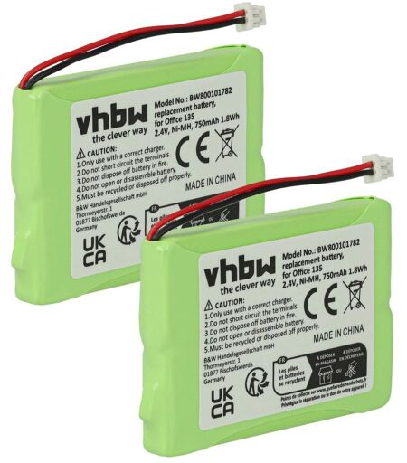 vhbw - the clever way - Batterie de rechange de haute qualité avec une grande autonomie et compatible avec votre téléphone (vous trouverez ci-dessous tous les modèles correspondants) - La batterie peut être chargée avec le chargeur standard ou un chargeur compatible - Nos batteries répondent à toutes les normes de sécurité actuelles CONTENU DE LIVRAISON : - 2x batterie DONNÉES TECHNIQUES : - Technologie : NiMH - Capacité : 750 mAh - Tension : 2,4 V - Énergie nominale : 1,8 Wh - Nombre de cellules : 2 - Poids : 38 g COMPATIBLE AVEC DeTeWe Aastra Pour garantir la compatibilité, veuillez vérifier si votre batterie utilisée actuellement est répertoriée. REMPLACEMENT POUR : - 2010 vhbw - Accessoires et pièces de rechange de haute qualité pour prolonger la durée de vie de vos appareils électriques. ...