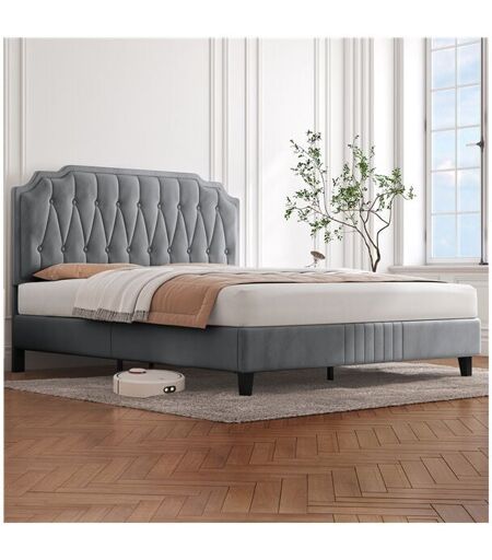 Description générale S'inspirant du design art déco, ce cadre de lit en bois est à la fois élégant et pratique. Avec ses lignes courbes audacieuses et sa tête de lit capitonnée, il offre un espace confortable pour se détendre, que ce soit pour regarder la télévision ou lire. Les bords du lit sont recouverts de velours sobre, ajoutant une touche d'élégance à votre intérieur. Sa construction robuste, avec des pieds en bois massif et des supports en métal, assure une stabilité optimale. Ce modèle classique est conçu pour s'accorder facilement avec divers décors et est compatible avec tous types de matelas. Spécifications techniques Matériaux : Bois stratifié, MDF, Bois de peuplier, Mousse, Métal, Polyester Couleur : Gris Clair Quantité de lattes : 10 Dimensions assemblées : 203 cm L × 166,5 cm l × 107,5-117,5 cm H Matelas applicable : 160 cm × 200 cm Distance entre la tête de lit et le sommier : 20,5-30,5 cm Hauteur du lit : 31 cm Espacement des lattes : 12-12,5 cm Garde au sol : 15,5 cm ...