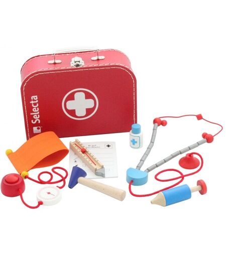 Tout ce dont un petit médecin a besoin se trouve dans cette mallette. Vous vous sentez mal ? Alors une visite chez le jeune docteur dans la chambre d?enfant vous soulagera certainement ! Son élégante trousse renferme de nombreux instruments solides et nécessaires à la visite médicale, le tout dans un design fiable adapté aux enfants. contenu : stéthoscope, tensiomètre à poire, thermomètre gradué, seringue, otoscope, flacons médicaux, carnet d?ordonnances Un jouet en bois fabriquée en Allemagn ...
