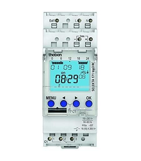 La minuterie permet une synchronisation facile de l'heure en connectant une antenne DCF ou GPS externe. Le GPS permet en outre une détermination de position pour le programme Astro. L'utilisation du GPS nécessite un adaptateur d'alimentation supplémentaire (9070892) lorsque un appareil est connecté à l'antenne. La minuterie offre une sécurité anti-sabotage maximale. Les programmes de commutation de l'heure peuvent uniquement être transmis par l'application à la montre, si le Bluetooth OBELISK top3 se trouve dans la montre. La minuterie Theben est 100 % compatible avec le top2 (lors de la transmission des programmes de commutation par OBELISK, le logiciel OBELISK doit être installé à partir de V3.8.3.4 ). Le Theben 1710330 SELEKTA 171 top3 RC dispose également de 3 programmes spéciaux (petit programme annuel) ainsi que 3 zones de crépuscularité réglables individuellement. ...
