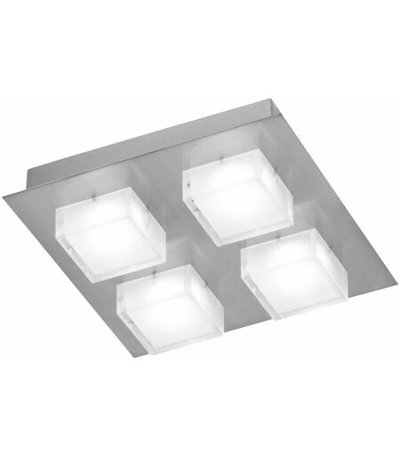 Description Cet élégant plafonnier illuminera votre espace de vie. Créez un accroche-regard dans vos quatre murs avec ce plafonnier à 4 ampoules et laissez-vous convaincre par son charisme incomparable. L'interaction du nickel et des cubes de verre complète le simple Le design de cette lampe correspond parfaitement et permet d'intégrer le plafonnier dans n'importe quelle pièce imaginable. détails luminaires • Type de lumière : Plafonnier • Matériau : Nickel mat • Abat-jour : Verre • Couleur : Nickel mat, blanc • Classe de protection : IP20 • Longueur x largeur x hauteur en cm : 26 x 26 x 6,5 • Douilles : 4x LED (installées en permanence ) • Ampoules incluses : Oui • Puissance des ampoules : 4x 3 watts • Flux lumineux : 4x 240 L umen • Couleur de la lumière : blanc chaud • Tension : 220-240V, 50-60Hz Source lumineuse détails • Type de source lumineuse : LED • flux lumineux : 240 lm (lumen) • Consommation énergétique : 3 kWh/1000h • Température de couleur : 3000 K (Kelvin) • Couleur ...