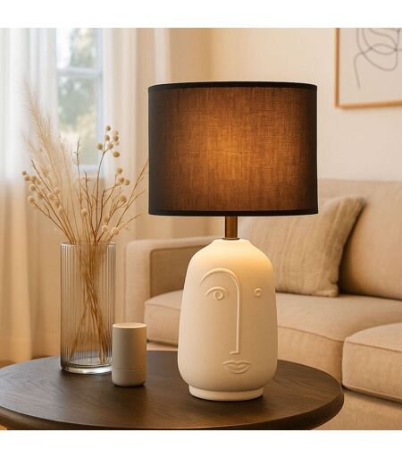 Description La lampe de table est une combinaison de design minimaliste et d'éclairage individuel. Sa base en céramique avec relief facial et son abat-jour en tissu noir offrent une lumière diffuse et confortable. Equipez-le d'une ampoule E14 jusqu'à 25W de votre choix pour une ambiance atmosphérique. Forme unique, couleur sobre – le point fort idéal pour chaque pièce. La lampe n'est pas incluse dans la livraison. Détails lampe • Type de lampe : lampe de table • Matériau : céramique, tissu • Couleur : blanc, noir • Classe de protection : IP20 • Classe de protection : 2 • Diamètre x hauteur en cm : 22 x 38,5 • Prise : 1x E14 • Ampoules non incluses • Puissance de la lampe : 1x max. 25 watts. • Alimentation : 230 V, 50 Hz ...