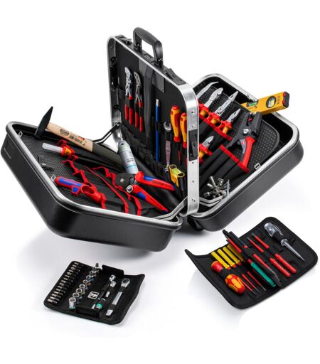 00 21 42 Mallette à outils « BIG Twin » Électro Comprend 63 outils de marque dont 14 KNIPEX, pour certains homologués VDE conformément à la norme DIN EN 60900. Avec un total de 95 compartiments d'insertion. Charge utile max. : 25 kg. Volume : 38 litres. Reste stable dans toutes les positions d'ouverture grâce aux porte-couvercles encliquetables avec charnières des deux côtés ; inclinaison librement ajustable. Ouverture possible d'un côté comme de l'autre. Le fond et le couvercle peuvent être ouverts indépendamment l'un de l'autre. Champ d'identification avec deux étiquettes pour l'étiquetage individuel. Version en ABS résistant, noir. Châssis en aluminium enveloppant avec paroi centrale robuste, solidement fixée, pouvant être installée des deux côtés, avec diverses options d'insertion polyvalentes grâce à des boucles élastiques et douze petites poches Charnières métalliques. Cadenas à trois chiffres pour verrouiller la mallette. Deux serrures à bascule en métal pour solidariser le ...