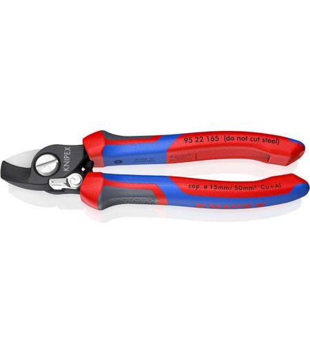 95 22 165 Coupe-câbles coupe nette du câble et sans écrasement. coupe facile avec prise d'une seule main. charnière vissée réglable, sécurité automatique. Coupe les câbles multibrins toronnés en cuivre et en aluminium jusqu'à Ø 15 mm (50 mm²). Ne convient pas aux fils d'acier, aux conducteurs en cuivre écrouis ni aux câbles métalliques. Tranchants trempés, meulés avec précision. Avec ergot protecteur. Avec poignées confort : composée de trois matériaux ergonomiques pour une préhension optimisée et avec deux emplacements KNIPEXtend pour les accessoires. ressort d'ouverture intégré dans la charnière: imperdable et protégé. - Capacité de coupe du câble en cuivre, multifilaire: 50mm² - Capacité de coupe du câble en cuivre, multifilaire: Ø 15mm - AWG: 1 / 0 ...