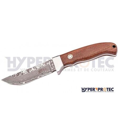 Herbertz Selecktion Damas Découvrez l'exclusivité et la fonctionnalité du couteau de ceinture Herbertz Selektion, un compagnon de chasse qui allie noblesse et performance. Ce couteau incarne l'élégance avec une lame en damas de 69 couches forgée autour d'un noyau en acier inoxydable AISI 440, entouré de 34 couches d'acier. La combinaison de matériaux de haute qualité offre une résistance exceptionnelle et une netteté de lame inégalée. Le design de ce couteau Herbertz Selektion est sublimé par un manche ergonomique en bois de cocobolo, offrant une prise en main confortable et une esthétique naturelle. Chaque détail a été soigneusement pensé, jusqu'à la broche en mosaïque qui complète l'ensemble, ajoutant une touche artistique à cet outil fonctionnel. Avec une longueur totale de 19 cm et un poids de 130 g, ce couteau de chasse Herbertz Selektion est parfaitement équilibré, offrant une maniabilité optimale lors de vos activités en plein air. La lame de 9 cm en acier inoxydable 420 Damas assure une coupe précise et durable, adaptée aux exigences de la chasse. Le couteau est livré avec un étui en cuir, soigneusement conçu pour assurer une protection optimale lors du transport. La présentation dans une boîte de sélection Herbertz ajoute une touche de prestige, faisant de ce couteau non seulement un outil fonctionnel mais aussi un objet de collection. Avec le couteau de ceinture Herbertz Selektion, vous faites le choix d'un compagnon de chasse exceptionnel, alliant l'artisanat de qualité à une esthétique raffinée, prêt à répondre à toutes vos attentes lors de vos aventures en plein air. Caractéristiques techniques Longueur totale: 19 cm Poids: 130 g Longueur de poignée: 10 cm Matériau du manche : Bois de de Cocobolo Longueur de la lame : 9 cm Matériau de la lame : Acier Inox 420 Damas ...