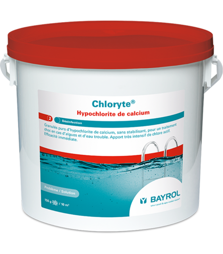 Avec une piscine, vous n'êtes jamais à l'abri de problèmes d'eau apportés par les polluants extérieurs tels que les micro-organismes ou l'air atmosphérique. Pour limiter cela, vous devez assurer un traitement de l'eau régulier et efficace. Avec Bayrol Chloryte, vous avez trouver la solution ultime ! [fsm display="image" ids="1742" link="0"] Optez pour le Chlore non stabilisé Bayrol Chloryte L'eau trouble ne sera pour vous qu'un mauvais souvenir ! Le Chlore Bayrol Chloryte est composé de granulés d'hypochlorite de calcium, un chlore non stabilisé. A dissolution très rapide, il agit en traitement choc pour éradiquer rapidement les impuretés de l'eau, tel que les algues, et redonne ainsi à votre eau toute la clarté qu'il lui faut. Il peut également être utilisé en traitement continu par l'intermédiaire d'une pompe doseuse ou d'un doseur sec. Garanti sans stabilisant de chlore, il permet de traiter les piscines sans risque de sur-stabilisation. En évitant la sur-stabilisation de votre eau, vous évitez la vidange de la piscine et vous gagnez donc un temps précieux. Apportant de manière intensive du chlore actif, Bayrol Chloryte assure une efficacité immédiate et rapide. Granulés de chlore non stabilisé hautement concentrés : 70% de chlore actif. Cuillère = dosage et application plus faciles. Idéal pour les eaux douces : augmente la dureté calcique. Solutions de dosages incluses = manipulation plus sûre et plus facile Dissolution rapide : efficacité immédiate en cas d'eau trouble ou de présence d'algues. Conditionnement : 5 kg Mode d'emploi Contrôlez le pH à l'aide des bandelettes d'analyse BAYROL ou du Pooltester BAYROL, et ajustez-le si nécessaire entre 7,0 et 7,4. En cas de problème d'eau : Versez 150 g de Chloryte pour 10 m³ d'eau directement dans le bassin, devant les buses de refoulement ou en plusieurs endroits du bassin, filtration en fonctionnement. Il est préférable d'effectuer cette opération le soir après la baignade. Laissez la pompe fonctionner pendant 12 heures. Vous pourrez vous baigner à nouveau dès que le taux de chlore sera descendu en-dessous de 3 mg/L. Pour une désinfection régulière : Utilisez 50 g de Chloryte pour 10 m³ d'eau. Se référer à la notice technique ci-jointe + bien lire les consignes présentes sur l'emballage avant utilisation. Recommandations importantes Ce produit est autorisé pour la désinfection des eaux de piscines publiques par le Conseil Supérieur d'Hygiène Publique de France (agrément n°123). Emballage agréé UN. Dangereux. Respecter les précautions d'emploi. Utiliser les biocides avec précaution. Avant toute utilisation, lire l'étiquette et les informations concernant le produit. Avant toute utilisation, assurez-vous que celle-ci est indispensable, notamment dans les lieux fréquentés par le grand public. Privilégiez chaque fois que possible les méthodes alternatives et les produits présentant le risque le plus faible pour la santé humaine et animale et pour l'environnement. ...