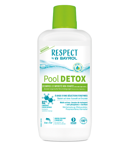 Pool Detox : Cure de vitamines pour améliorer l'efficacité du traitement de l'eau tout au long de la saison ! Le nouveau Pool Detox Respect by Bayrol 1L élimine les déchets organiques non-vivants comme les crèmes solaires pour renforcer l'efficacité du désinfectant, il réduit la présence de phosphates et agit en continu même en présence de baigneurs. Le Pool Detox Respect by Bayrol 1L est compatible tout type de filtre et de désinfectant. [fsm display="image" ids="809" link="0"] Le Bénéfice Eco : Réduit la quantité de produits chimiques nécessaires pour traiter l'eau Atouts du Pool Detox Formulé à base d'enzymes, il décompose les déchets organiques non-vivants Multi-actions : il réduit également les phosphates et agit comme clarifiant Compatible tous filtres* et méthodes de désinfection, il s'adapte à tous les bassins Il optimise les 5 étapes de traitement afin de faciliter l'entretien et de garantir une eau saine et belle avec moins d'efforts Son bouchon doseur intégré permet un dosage précis garantissant une utilisation juste et économique du produit *à l'exception des filtres à diatomées Caractéristiques du Pool Detox Utilisation : 25ml/10m3 chaque semaine à toutes les 2 semaines = environ 3 mois d'utilisation Packaging : flacon 1L - 100% plastique recyclé & recyclable Formule : A base d'enzymes d'origine naturelle - 82% d'ingrédients d'origine naturelle + Lanthane + clarifiant [fsm display="image" ids="1744" link="0"] La marque Respect by Bayrol C'est la 1ère marque éco-responsable de traitement de l'eau qui respecte l'homme et l'environnement. Packaging recyclables 100% fabriqué à l'aide de plastique recyclé* Réduction de l'empreinte carbone [fsm display="image" ids="1743" link="0"] *sauf les bouchons Des produits aux formulations à base d'ingrédients d'origine naturelle [fsm display="image" ids="324" link="0"] ...