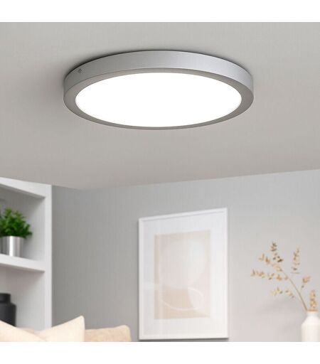 Description Ce plafonnier rond à LED allie un design discret à une technique d'éclairage moderne. Le corps en métal et en plastique est ennobli par une finition chromée mate et s'intègre parfaitement dans les pièces aménagées de manière contemporaine. Avec une puissance de 21,4 watts, la LED fixe diffuse une lumière puissante de 2200 lumens dans une température de couleur blanc neutre de 4000 kelvins. Grâce à sa construction plate de seulement 3,2 cm, le luminaire convient particulièrement bien aux pièces à plafond bas. La longue durée de vie et la facilité de montage font de ce plafonnier un diffuseur de lumière fiable au quotidien. L'ampoule LED est intégrée dans le luminaire. Détails du luminaire • Type de lampe : plafonnier • Matériaux : plastique, métal • Couleur : chrome mat • classe de protection : IP20 • classe de protection : 2 • forme : ronde • Diamètre x hauteur en cm : 30x3,2 • Source lumineuse : 1x LED • Source lumineuse fixe • Puissance de la lampe : 1x 21,4 watts • Flux ...