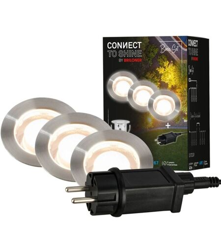 Lot de 3 spots de sol LED encastrables pour le syst me de jardin Connect to Shine 12V de Briloner Illuminez votre espace ext rieur avec notre kit de d marrage de spots de sol LED 12V, sp cialement con u pour un clairage d'ambiance et efficace de votre terrasse et de votre coin salon. Ce kit se compose de trois lampes LED encastr es dans le sol, qui convainquent non seulement par leur long vit , mais aussi par leur grande r sistance aux intemp ries. D tails du produit clairage agr able : trois lampes encastr es dans le sol d'une puissance de 0,6W chacune, qui fournissent ensemble 120 lumens avec une temp rature de couleur blanc chaud agr able de 3000K. R sistant aux intemp ries : Gr ce la certification IP67, les lampes encastr es sont tanches la poussi re et prot g es contre l'immersion temporaire dans l'eau, ce qui en fait le choix id al pour toute application ext rieure dans un environnement humide. Dimensions des produits et longueurs des c bles : Chaque luminaire mesure 30x26mm, ce ...