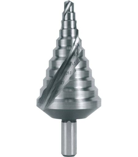 Informations techniques Taille n° : 17 Nombre d'étages : 11 Angle de pointe : 118 ° Angle de pas : 90° Informations techniques Diamètre de tige : 10 mm Données techniques complémentaires : Taille n° : 17 Nombre d'étages : 11 Angle de pointe : 118 ° Angle de pas : 90° Longueur totale : 96 mm Mandrin porte-outil (perceuse) : tige à 3 surfaces Matériau (perceuse) : HSS Plage de Ø de perçage : 6.5 - 40.5 mm Foret étagé HSS, spiralé avec raccord en croix pour presse-étoupes métriques La rainure de serrage en forme de spirale et de profondeur offre un fonctionnement silencieux et une puissance de coupe élevée. En particulier, les copeaux qui ne cassent pas sont évacués proprement comme dans le cas d'un foret hélicoïdal. Cela réduit la formation de sections de caisse et de soudures à froid sur les lames de coupe. Le cône facilite le retrait en cas de tôles forées. Ce texte a été traduit par une machine. Points forts 6,5 / 8,5 / 10,5 / 12,5 / 16,5 / 20,5 / 25,5 / 29,0 / 32,5 / 36,5 / 40,5 mm ...