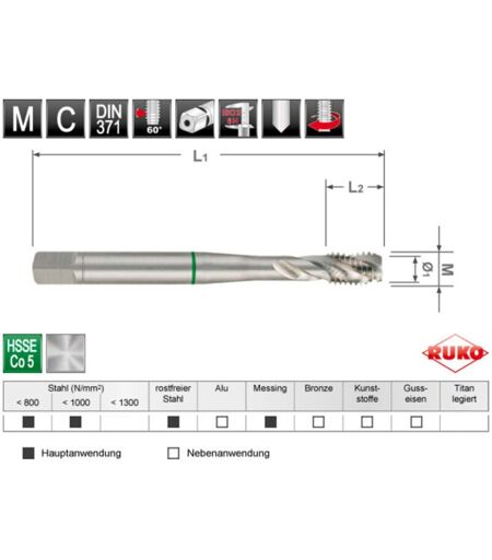RUKO Taraud machine hélicoïdal DIN 371 HSS Co 5, M 3