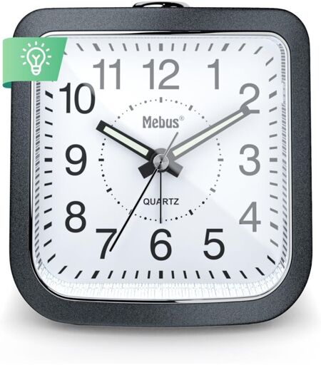 MEBUS Réveil à quartz, silencieux, sans contact, aiguilles lumineuses, alarme snooze, alarme snooze, cadran éclairé par simple pression sur un bouton,