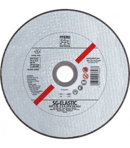 Meule à tronçonner SG-ELASTIC-ALU pour l'usinage de l'aluminium Ø x épaisseur : 178 x 1,6 mm, Modèle Droit, Vitesse maxi. 8600 tr/mn - Puissance de tronçonnage élevée et très bonne tenue de coupe - Faible formation de bavures en cas de largeur de disque d'1,0 1,6 1,8 mm - Alésage standard de 22,23 mm - Pour l'usinage des profils et de matériaux pleins, des tôles et des métaux non ferreux Remarque : lors des travaux réalisés avec des disques à tronçonner fin de la version droite, Ø de 178 mm, il est recommandé d'utiliser le jeu de brides de serrage référence 42 32404 100 pour une plus grande stabilité latérale. ...