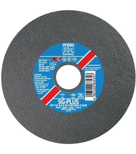 Disque à tronçonner SG-PLUS-INOX X-SLIM pour l'usinage de l'acier inoxydable Ø x épaisseur : 115 x 0,8 mm, Modèle Droit, Vitesse maxi. 13300 tr/mn - Puissance de tronçonnage maximale et tenue de coupe remarquable - Très faible formation de bavures - Bruits réduits - Vibrations réduites - Dégagement de poussières réduit - Alésage standard de 22,23 mm - Pour l'usinage de tôles, de profils et de matériaux pleins Remarque : obtient les meilleurs résultats sur des meules à turbines à air comprimé et des meules haute fréquence et meules d'angle électriques ...
