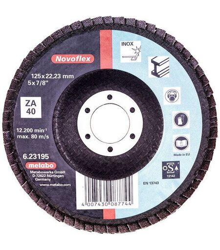 Convient au ponçage grossier et intermédiaire de tous les métaux, acier inoxydable, acier, fonte de fer et tôle d'acier Qualité Novoflex : entrée de gamme performante Performance abrasive élevée et régulière Ponçage à froid Résultat de ponçage uniforme ; ponçage confortable avec très peu de vibrations Convient particulièrement au travail des aciers inoxydables Vitesse de travail maximale 80 m/sec. Modèle en biais : angle d'attaque 7-9° Caractéristiques techniques : Diamètre x alésage : 125 x 22.23 mm Granulométrie : P 60 Modèle : biais Vitesse de rotation max. : 12200 /min Unité de vente / unité d’emballage : 1 / 10 ...