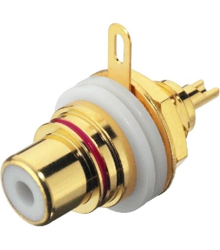 Fiches RCA châssis femelles: Données techniques: Type: prise châssis femelle, Type: RCA, Nombre: 2, Type: doré, Couleur / Repère couleur: rouge / noir, Branchements: RCA femelle, Matériau: métal, Fixation centrale: Ø 9.5 mm, Température fonc.: 0-40 °C, Diamètre: trou Ø 9.5 mm, Poids: 18 g, Particularités: High-End. isolant ...