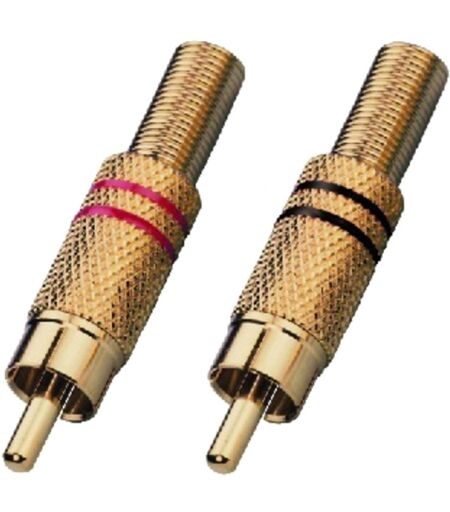 Fiche RCA mâle: plaquée orProtège-câble, Pour câble Ø 7 mm, Repères rouge et noir, Données techniques: Type: mâle, Type: RCA, Nombre: 2, Type: doré, Couleur / Repère couleur: rouge / noir, Entrée câble: Ø 7 mm, Protège-câble: oui, Température fonc.: 0-40 °C, Poids: 26 g ...