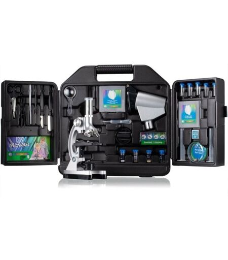 Il contient tout le matériel nécessaire pour vos premières expériences, dont 3 objectifs pour avoir différents grossissements, et une mallette pour le transporter plus facilement. Caractéristiques Grossissements avec les accessoires inclus: 300x, 600x, 1200x Éclairage alimenté par pile non incluses Contenu Microscope Oculaire: 40x 3 objectifs: 7,5x / 15x / 30x Boite avec 5 lames préparées 5 lames vierges et 10 couvre-lames Kit de dissection (ciseaux, pince à épiler, pipette et 2 aiguilles de dissection) Spécimen set (écloserie, œufs de crevettes, levure, sel de mer et gomme) Mallette en plastique Dès 8 ans ...