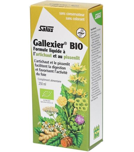 Complément alimentaire à utiliser dans le cadre d’une alimentation variée, équilibrée et d’un mode de vie sain.Gallexier BIO, formule liquide à l’artichaut et au pissenlit,est un complément alimentaire contenant 12 extraits végétaux.Gallexier BIO est un tonique digestif, un biostimulant des fonctions gastro-intestinales aux plantes naturelles dont l’artichaut, le pissenlit et le curcuma.L’artichaut aide à soutenir la digestion et à favoriser l’activité du foie.Le pissenlit contribue au fonctionnement normal de l’estomac et du foie.Le pissenlit grâce à sa richesse en principes amers est l’un des détoxiquants végétaux les plus efficaces.Le pissenlit et le curcuma contribuent à stimuler l’appétit.Gallexier BIO est sans alcool, conservateur ou colorant.Il ne contient ni gluten ni levure et convient aux végétariens et végétaliens.Cette bouteille contient 12 doses journalières de 20 ml.IngrédientsExtrait aqueux (75 %) de plantes bio de : feuille d’artichaut bio (Cynara cardunculus subsp. flavescens), feuille de pissenlit bio (Taraxacum officinale), racine de gentiane bio (Gentiana lutea), rhizome de curcuma bio (Curcuma longa), partie aérienne d’achillée millefeuille bio (Achillea millefolium), rhizome de gingembre bio (Zingiber officinale), fruit de fenouil amer bio (Foeniculum vulgare), fleur de camomille bio (Matricaria chamomilla), zeste d’orange bio (Citrus sinensis), partie aérienne de chardon béni bio (Cnicus benedictus), fruit de cardamome bio (Elettaria cardamomum).Sirop d’agave bio.Valeurs nutritionnellesExtrait aqueux de plantes depour 20 mlpour 40 mlfeuille d’artichaut bio6,5 g13,0 gfeuille de pissenlit bio2,1 g4,2 gracine de gentiane bio1,6 g3,1 grhizome de curcuma bio1,2 g2,4 gpartie aérienne d’achillée millefeuille bio1,2 g2,4 grhizome de gingembre bio0,8 g1,6 gfruit de fenouil amer bio0,8 g1,5 gfleur de camomille bio0,7 g1,5 gzeste d’orange douce bio0,6 g1,2 gpartie aérienne de chardon béni bio0,4 g0,7 gfruit de cardamome bio0,2 g0,3 gConseils d'utilisation20 ml par jour comme apéritif ou comme digestif.Précautions d'emploiNe pas dépasser la dose journalière conseillée.Consultez votre professionnel de santé en cas de prise d’anticoagulants.Ne pas administrer aux enfants de moins de 12 ans, aux femmes enceintes ou allaitantes.L’usage prolongé est déconseillé.Un complément alimentaire ne peut pas être utilisé comme substitut d’un régime alimentaire varié et équilibré et d’un mode de vie sain.Poids net250 mlAdresse du FabricantSALUS Haus83052 Bruckmühl ...