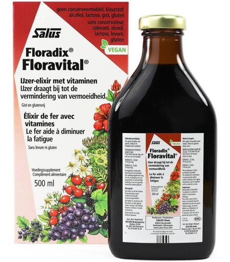 Complément alimentaire à utiliser dans le cadre d’une alimentation variée, équilibrée et d’un mode de vie sain.Salus Floradix® FloravitalÉlixir de fer liquide. Contient du fer et des vitamines B et C pour soutenir le métabolisme énergétique (vitamines B1, B2, B6 et B12) et le système immunitaire (vitamine C). Vite fatigué(e) ? Floradix Floravital est un élixir de fer liquide complété d'extraits végétaux et de concentrés de fruits. Floravital contient une forme de fer facilement assimilable et digestible et fournit également des nutriments importants comme les vitamines B. Le fer aide à réduire la fatigue. Les vitamines B1, B2, B6 et B12 contribuent au métabolisme énergétique normal et la vitamine C augmente l'absorption du fer. La vitamine C contribue également au fonctionnement normal du système immunitaire. L'élixir de fer Floravital est idéal pour soutenir son métabolisme énergétique et son système immunitaire : par exemple pendant la grossesse et l'allaitement, chez les enfants en pleine croissance, les seniors ou les athlètes. L'élixir de fer Floravital est dépourvu d'alcool, de conservateurs, de colorants, d'arômes artificiels, de levure, de gluten et de lactose et convient également aux végétariens et aux végans. Élixir de fer liquide Aux vitamines B12, C, B6, B1 et B2 Sans conservateur, colorant, alcool, lactose, levure et gluten Végane À propos de Salus Salus est depuis 1916 synonyme de compléments alimentaires liquides, de comprimés, de jus de plantes et de thés naturels de grande qualité. Une équipe de scientifiques veille à ce que tous les produits soient conformes aux dernières avancées scientifiques. Salus fixe pour ses produits des exigences plus élevées que celles prescrites par la loi. La sélection rigoureuse commence par la culture des matières premières. Toutes les plantes et herbes utilisées par Salus sont dans la mesure du possible biologiques, c.-à-d. cultivées sans engrais artificiels ni pesticides chimiques. Des techniques de production spéciales préservent les ingrédients actifs des herbes et évitent de polluer inutilement l'environnement. Les produits de Salus constituent donc le « meilleur de la nature ».IngrédientsExtrait de plante aqueuse (70 %) de : fleur d'hibiscus (hibiscus sabdariffa), fleur de camomille (matricaria recutita), fruit de fenouil (foeniculum vulgare), feuille d'épinard (Spinacia oleracea). Mélange de jus de fruits concentrés (27 %) de : raisin (vitis vinifera), poire (pyrus communis), jus de cassis (ribes nigrum), cerise (prunus cerasus), mûre (rubus fruticosus), carotte (daucus carota). Gluconate de fer (II), extraits aqueux de cynorrhodon (rosa canina) avec 4 % de vitamine C, vitamine C (acide L-ascorbique), vitamine B2 (riboflavine de sodium-5'-phosphate), vitamine B6 (chlorhydrate de pyridoxine), vitamine B1 (chlorhydrate de thiamine), vitamine B12 (cyanocobalamine). Données nutritionnelles Principe actif Par 20 ml AR* Fer 19,2 mg 137 % Vitamine B1 1,72 mg 156 % Vitamine B2 1,72 mg 123... ...