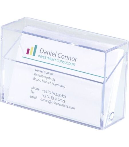 Informations techniques Couleur : transparent Dimensions produit, hauteur : 60 mm Dimensions produit, largeur : 95 mm Dimensions produit, profondeur : 30 mm Nombre de compartiments : 1 dimension maximale de la carte supportée : 96 x 60 mm (l x H) nombre maximum de cartes : 100 cartes Boîte de cartes de visite transparente, pour 100 cartes max. (86x56 mm max.) Boîte de cartes de visite transparente en plastique dur avec double fonction pratique : en cas de fermeture, elle sert de boîte de rangement sécurisée et s'ouvre comme support pour la présentation des cartes de visite. La boîte peut accueillir jusqu'à 100 cartes de visite (86 x 56 mm max.). Les dimensions extérieures sont de 100 x 70 x 10 mm (L x H x P). Ce texte a été traduit par une machine. Points forts Boîte de cartes de visite transparente en plastique dur avec double fonction pratique Lorsqu'il est fermé, il sert de boîte de rangement sécurisée Ouvert en tant que présentoir pour la présentation des cartes de visite Les ...