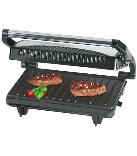 Multigrill pour une grillade double face, sans graisse 700 watts Boîtier en acier inoxydable Temps de cuisson courts Plaques de gril à revêtement antiadhésif avec des rainures extra profondes pour un motif de gril puissant Poignée isolée de la chaleur Voyant lumineux Surfaces de gril : 23 x 14,5 cm Rangement du cordon Utilisation polyvalente, par exemple pour les panini, les steaks, le poisson ou les légumes. 220-240 V, 50/60 Hz, 700 W ...
