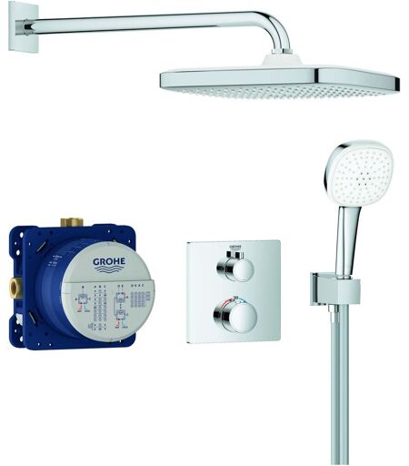 Grohe Grohtherm système de douche 34871000 composé de : Mitigeur thermostatique de douche à encastrer avec inverseur 2 voies intégré (24 079) Boîte d'installation universelle GROHE Rapido SmartBox, 1/2" (35 604) Ensemble de douche de tête Tempesta 250 Cube 9,5 l/min (26 687) avec bras de douche horizontal 380 mm Douchette à main Tempesta 110 Cube 2 types de jets (27 571) Coude de raccordement mural 1/2" avec support de douche mural (26 370) Flexible de douche Rotaflex 1 500 mm (28 409) Stabilisateur de débit 9,5 l/min en option pour douchette à main inclus ...