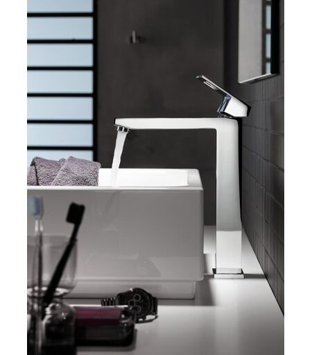 Eurocube Mitigeur monocommande 1/2" Lavabo Taille XL Monotrou sur plage Levier de commande métallique Version rehaussée pour Lavabo îlot GROHE SilkMove Cartouche en céramique 28 mm Limiteur de température GROHE StarLight chrome éclatant et durable GROHE EcoJoy économie d’eau, SpeedClean mousseur 5 l/min GROHE QuickFix Plus installation ultra rapide Corps lisse Flexibles de raccordement souples, sertis d’usine Pression minimale 1 bar ...