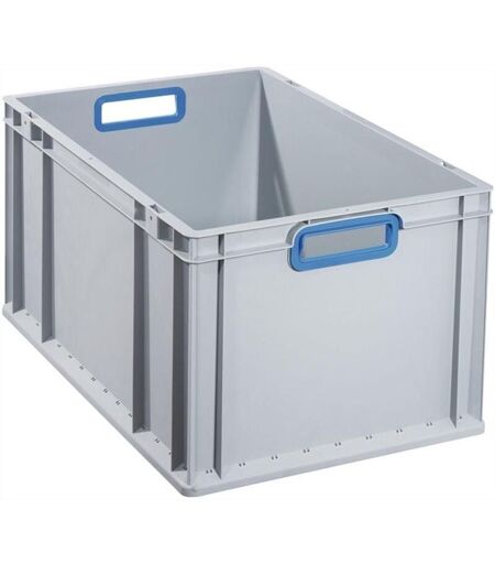 Gris · polypropylène formstable · parois renforcées à nervures · adapté aux dimensions des palettes européennes · rebord de empilement auto-centreur et périphérique · nettoyage optimal grâce aux parois intérieures lisses · résistant à la plupart des acides et huiles · résistant à des températures de -10 °C à +60 °C · parois fermées · poignée bleue ouverte ...