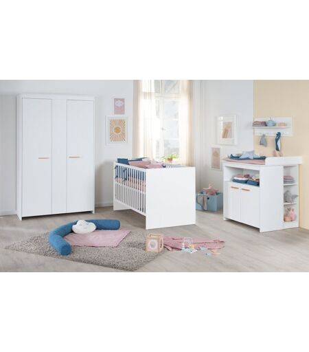 Points forts : MOBILIER POUR ENFANTS MODERNE : L'ensemble comprend un lit, une table à langer et une armoire - Blanc simple avec poignées en bois véritable comme point visuel - Utilisation de matériaux et de peintures sans polluants. LIT ÉVOLUTIF : Le lit bébé 70 x 140 cm offre 3 barres de glissement, est réglable en hauteur sur 3 niveaux et peut être converti plus tard en un lit junior avec des côtés de conversion disponibles séparément (Réf. 10012WE) - Construit selon EN 716-1:2017+AC:2019. TABLE À LANGER AVEC PLAN AMOVIBLE : Utilisable plus tard comme commode dans la chambre d'enfant - Division pratique avec compartiment ouvert, 2 tiroirs, une porte - Dimensions: H 103 x L 117.5 x P 77/40 cm (avec/sans plan) - Développé selon EN 12221 - 1+2:2008 + A1:2013. ARMOIRE POUR ENFANTS : 5 compartiments séparés avec 2 barres de vêtements courtes (chacune de 66 cm de long) - Dimensions: H 190 x L 115 x P 50 cm - Charnières à fermeture douce pour une fermeture douce - Laque blanche intemporelle et poignées en bois pour une élégance moderne. COLLECTION EXTENSIBLE : L'ensemble de 3 pièces peut être combiné avec des meubles pour enfants roba, des accessoires pour bébés ou des textiles doux - Convient également à d'autres meubles de la collection 'Anton'. Dimensions et poids: Lit évolutif : H 82 x L 76 x P 144 cm - Côtés de transformation assortis (Réf. 10012WE) Commode à langer : H 103 x L 117,5 x P 77/40 cm - Étagère latérale assortie (Réf. 38625) Armoire : H 190 x L 115 x P 50 cm 145,00 kg Détails du produit / Informations complémentaires : L'ensemble de chambre 'Lilo' offre la combinaison idéale de fonctionnalité, de sécurité et de design élégant pour la chambre de bébé et d'enfant. Il comprend un lit d'enfant combiné avec une taille de matelas de 70x140 cm, une table à langer et une armoire à 2 portes, offrant tout ce dont vous avez besoin pour une configuration initiale optimale. Le lit d'enfant combiné moderne 'Lilo' est en blanc simple et dispose de trois niveaux de hauteur variables pour une position ergonomique. Avec des dimensions de H 80 x L 76 x P 142 cm et des barres de glissement amovibles, il convient jusqu'à l'âge de 7 ans. Avec des côtés de conversion disponibles séparément (Réf. 10012WE), il peut être facilement converti en un lit junior, permettant de grandir avec votre enfant et permettant une utilisation à long terme. Il est certifié selon EN 716-1:2017+AC:2019, vous donnant l'assurance que votre enfant peut dormir en toute sécurité. La table à langer impressionne non seulement par son design élégant mais aussi par son agencement pratique. Avec des dimensions de H 98 x L 107 x P 75 / 45.5 cm (avec / sans plan) et un accessoire de change amovible, elle offre suffisamment d'espace de rangement pour tous les ustensiles de soins de votre enfant. La table à langer, construite selon la norme de sécurité européenne EN 12221 - 1+2:2008 + A1:2013, peut être éventuellement étendue avec une ou deux étagères latérales roba (Réf. 38625). Après la... ...