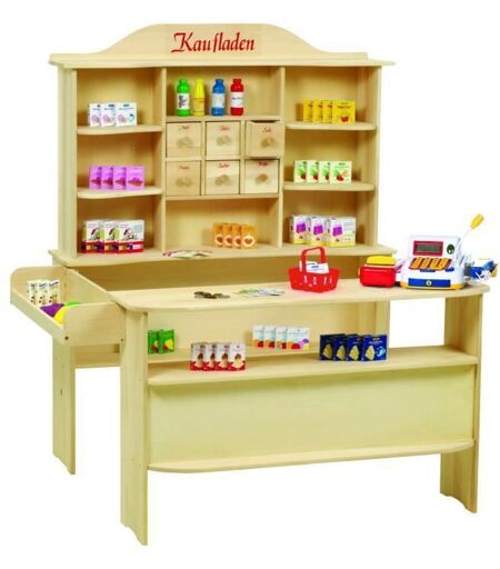 Le Grand Marché en bois ROBA est un jouet d'imitation idéal pour les jeux de rôle autour du shopping et de la promenade. Il est livré avec une caisse enregistreuse électronique, de l'argent liquide, une carte de débit, un panier à provisions et de nombreux autres articles de petit commerce. ...