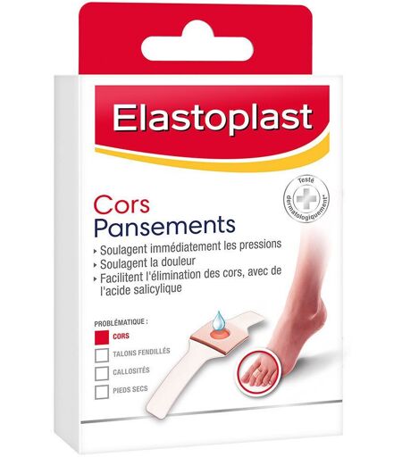 Taille du pansement: 6,8 cm x 1,9 cm Indication: Pansement adhésif coricide diminue immédiatement Description du produit: Elastoplast Pansements Cors soulagent immédiatement la douleur provoquée par la pression et les frottements et aident à éliminer les cors. Ils possèdent un anneau de mousse qui apaise instantanément la douleur et la pression sur la zone concernée. L'acide salicylique se trouvant au centre de l'anneau ramollit la corne. Au bout de 4 jours, le cor peut être éliminé dans un bain chaud d'eau savonneuse ou salée. Compatibilité avec la peau testée sous contrôle dermatologique. Bénéfices: Soulage la douleur Coussinet anti-pression Aide à éliminer les cors Conseils d'utilisation. Nettoyer soigneusement la zone à l'eau et au savon et bien sécher. Appliquer le pansement en veillant à ce que l'ouverture de l'anneau de mousse se trouve directement sur le cor. Au bout de 2 jours, renouveler le pansement. Au bout de 4 jours, la corne ramollie peut être éliminée dans un bain d'eau chaude savonneuse ou salée. Si nécessaire, renouveler le traitement. Précautions d'emploi: Un pansement contient 0,04 g d'acide salicylique. Ne pas utiliser en cas d'hypersensibilité à l'acide salicylique, aux salicylates, au caoutchouc, ni en cas de lésion ou de maladie de peau. Ne pas utiliser en cas de diabète ou de troubles de la circulation. Ne convient pas aux enfants. En cas d'insuffisance rénale, demander conseil au médecin traitant. Le pansement ne doit pas entrer en contact avec les muqueuses. Eviter en particulier tout contact avec les yeux. L'acide salicylique peut augmenter la perméabilité de la peau à d'autres médicaments utilisés localement. Des irritations localisées (brûlures ou rougeurs) peuvent apparaître dans de rares cas. Dans certains cas, des réactions cutanées allergiques peuvent se produire. Ne pas utiliser plusieurs pansements en même temps et sur une longue période sans avis médical. Conserver au sec et à une température inférieure à 25ºC. Exclusivement pour usage externe. Pour usage unique seulement. Utiliser un nouveau pansement à chaque application pour obtenir l'effet décrit plus haut. Composition: Mousse Anti-pression. Acide salicylique. 8 pansements 68mmx19mm. Conditionnement: pansements x8 ...