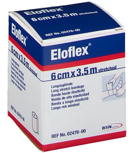 Taille du pansement : 6 cm x 3,5 mIndications:Eloflex® convient parfaitement aux bandages de soutien et de soulagement des maladies des ligaments et des appareils de maintien ainsi qu'aux bandages de sport, par exempleLuxationsDistorsionsContusionsTendovaginite et pour la réduction des oedèmes post-traumatiques et pour les bandages de compression dans les indications phlébologiquesProphylaxie de la thromboseDescription du produit :Les bandes de soutien doivent répondre à des exigences particulières. D'une part, ils doivent fournir un soutien suffisant pour que les mouvements puissent être bien guidés et que l'on puisse éviter les contraintes excessives. D'autre part, il doit être possible d'appliquer une charge sans entrave. Le bandage haute élasticité permanente Eloflex® à étirement long offre les meilleures propriétés pour cela.Eloflex® présente une légère compression, est perméable à l'air, extensible et confortable pour la peau. Il a une extension longitudinale d'environ 180 % et est insensible à la sueur et aux pommades. En cas d'application circulaire, la compression diminue de façon continue du distal au proximal. Le pansement conserve son élasticité permanente même après des lavages répétés (en tenant compte des instructions de lavage spéciales) et peut être stérilisé.Conseils d'utilisation:De plusieurs jours à plusieurs semaines, en tenant compte des intervalles de changement recommandés.Composition:57 % coton, 33 % viscose, 8 % polyamide et 2 % élasthanneConditionnement:1 pièce ...