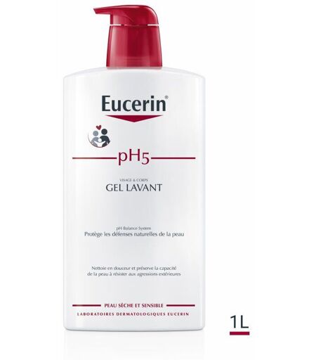 La peau sèche et sensible peut facilement être irritée par des agressions extérieures, ce qui a tendance à encore plus accentuer sa sensibilité. C’est pourquoi elle a besoin d’un nettoyage doux pour réduire sa sensibilité. Eucerin pH5 Gel Lavant est un soin lavant quotidien Visage et Corps sans savon alcalin. Il a été spécialement formulé pour rendre la peau sensible normale à sèche plus résistante et moins sensible. Le Système Eucerin pH Balance permet d'aider à restaurer et maintenir le pH optimal de la peau sans la dessécher. Convient à un usage pour les bébés et les enfants. Gel lavant pour peaux sensibles. Nettoie en douceur et procure du confort à la peau. Convient à un usage quotidien. Protège la barrière naturelle de la peau. Convient à toute la famille. Indications Un Gel Lavant doux pour le corps qui protège les défenses naturelles de la peau et préserve du dessèchement cutanée. Conseils d'utilisation Appliquer le produit en massant. Il va former une mousse pour nettoyer la peau. Peut être utilisé dans la douche ou le bain aussi souvent que nécessaire. Composition Aqua, Sodium Cocoamphoacetate, Sodium Myreth Sulfate, Lauryl Glucoside, Citric Acid, PEG-40 Hydrogenated Castor Oil, PEG-200 Hydrogenated Glyceryl Palmate, Coco Glucoside, Glycol Distearate, Glycérine, Polyquaternium-10, Diammonium Citrate, Sodium Benzoate, Sodium Salicylate, Linalool, Butylphenyl Methylpropional, Alpha-Isomethyl Ionone, Hexyl Cinnamal, Parfum Conditionnement Flacon-pompe de 1 L ...