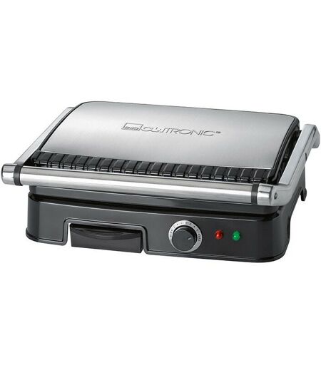 Grille de contact pour une grillade double face sans graisse Canal d'évacuation des graisses et bac de récupération (bac amovible pour un nettoyage facile) 2000 watts Boîtier en acier inoxydable Thermostat réglable en continu Temps de cuisson courts Plaques de gril anti-adhésives avec des rainures très profondes pour une forte et un bon écoulement des graisses Grande poignée isolée de la chaleur 2 témoins lumineux pour l'alimentation et le chauffage Affichage de la température "prêt". Grande surface de gril : environ 29,5 x 23,5 cm Rangement du cordon Utilisation polyvalente, par exemple pour les paninis, les steaks, le poisson ou les légumes. 220-240 V, 50/60 Hz, 2000 W ...