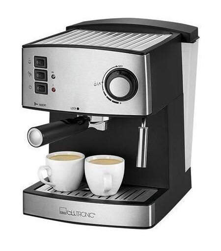 Machine à pompe pour espresso et cappuccino Façade en acier inoxydable Pression constante de la pompe jusqu'à 15 bars Buse vapeur pivotante en acier inoxydable avec fonction mousse et eau chaude Quantité de vapeur réglable en continu Embout de la buse vapeur amovible pour un nettoyage facile Fonction chauffe-tasses avec insert en acier inoxydable Réservoir d'eau transparent de 1,6 litre (amovible) Indicateur de niveau d'eau externe Bac de récupération avec grille d'égouttement en acier inoxydable (amovible) 2 voyants lumineux Arrêt automatique Indication de l'état de fonctionnement Accessoires : 2 porte-filtres (1 et 2 tasses), mesure du café, tamper 220-240 V, 50 Hz, 850 W ...