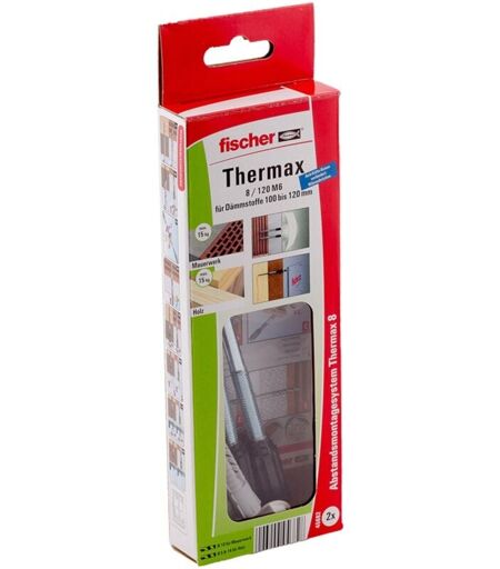 Das Fischer Abstandsmontagesystem Thermax 8 ist eine Lösung zur Befestigung in der Außenwand ohne Wärmebrücken im WDVS Die Stockschraube mit dem glasfaserverstärkten Konus fräst sich selbstschneidend durch den Putz in den Dämmstoff Die Stockschraube wird bei der Montage in den Universaldübel UX gedreht und verankert somit sicher im Baustoff Der Anti-Kälte-Konus am Kopf der Stockschraube unterbricht die Wärmebrücke und nimmt die äußere Befestigung auf Der Thermax befestigt leichte Lasten wie Leuchten, Briefkästen oder Blitzableiter in Beton, Porenbeton und Mauerwerk aus Loch- und Vollstein Vorteile Die Abstandsmontage erlaubt ein Justieren des Anbauteils zur exakten Positionierung, wobei Druckstellen oder Beschädigungen des WDVS vermieden werden Der Kunststoffkonus unterbricht die Wärmebrücke zwischen dem Anbauteil und der inneren Befestigung und bietet eine energetisch optimierte Befestigung Der glasfaserverstärkte Kunststoffkonus fräst sich formschlüssig in das WDVS und ermöglicht ...