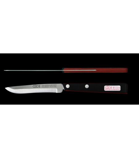 Couteau de table Universel GUDE 10cm Solingen. Manche noir/rouge laminé, poli miroir. Lame en acier trempé, inoxydable, à haute teneur en carbone. Lame micro dentée. Affûtage concave pour un excellent compromis tranchant/durabilité. Fabriqué à Solingen en Allemagne. Lavable au lave-vaisselle. ...