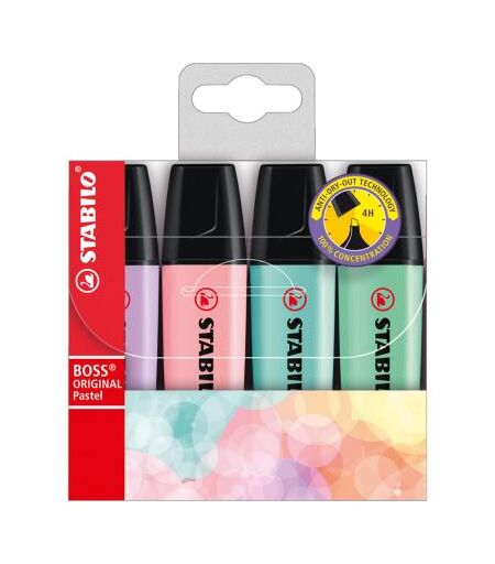 Stabilo Surligneur à corps plat, BOSS® Original, couleurs pastel assorties, pointe biseautée, 2-5 mm (blister 4 unités)