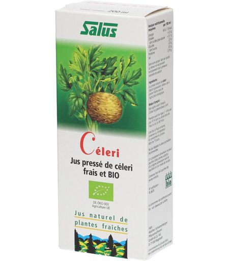 Il est important d'avoir une alimentation variée et équilibrée et un mode de vie sain.Le jus de céleri Schoenenberger est le pur jus pressé de tubercules et de feuilles de céleri frais de l'usine.Tous les jus de plantes et de légumes Schoenenberger sont issus de l'agriculture biologique contrôlée.Composition: Le jus des tubercules de céleri frais avec le chou.Valeur nutritionnelle: Pour 100 ml % AJR* Énergie 43 kJ/10 kcal Graisses <0,5 g dont acides gras saturés <0,1 g Glucides 1,7 g dont sucres 1,7 g Protéines 0,5 g Sel 0,2 g Conseil d'utilisation:Boire 10 ml de jus dilué avec 6 fois la quantité de liquide 3 à 4 fois par jour avant les repas.Buvez beaucoup (thé, eau minérale) au cours de la journée.Précautions d'emploi: Conservation à l'abri de la chaleur et de l'humidité. Tenir hors de portée des jeunes enfants. Poids net: 200 mlFabricant: SALUS Haus Bahnhofstr. 24 83052 Bruckmühl ...