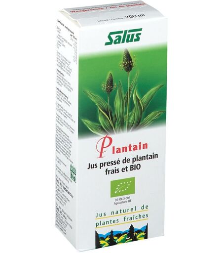 Complément alimentaire à utiliser dans le cadre d’une alimentation variée, équilibrée, d’un mode de vie sain.Excellent adoucissant des voies respiratoires, le plantain est une plante traditionnelle utilisée en cas d’irritation des muqueuses qui tapissent la gorge et le pharynx.Doux et agréable au goût, le suc de plantain aide à faciliter la respiration et à lutter contre les picotements de la gorge. Il a donc tout naturellement trouvé sa place parmi les alternatives naturelles pour enfants.BioSans alcoolSans sucreSans conservateurSans colorantComposition:Suc de plantain (Plantago lanceolata / partie aérienne) tiré de la plante fraîche issue de l’agriculture biologique.Valeur nutritionnelle: Par 100 mlÉnergie29 kJ / 7 kcalGraisses dont acides gras saturés< 0,5 g< 0,1 gGlucides dont sucres 1,5 g1,5 gProtéines< 0,5 gSel0,01 gConseil d'utilisation:3 fois par jour avant les repas, 10 ml dans de l’eau ou du jus de fruits. Bien agiter avant emploi. Utiliser le gobelet-doseur joint. Précautions d'emploi:Une fois le flacon entamé, conserver au réfrigérateur et consommer le contenu dans les 15 jours. Ne pas dépasser la dose journalière recommandée. Conserver hors de la portée des enfants.Poids net:200 mlFabricant:Walther SchoenenbergerPflanzensaftwerkGmbH & Co. KGD-71106 MagstadtAllemagne ...