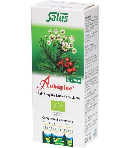 Complément alimentaire à utiliser dans le cadre d’une alimentation variée, équilibrée et d’un mode de vie sain.LES SUCS DE PLANTES FRAÎCHES SALUSsont basés sur la conviction des bienfaits des plantes fraîches sur la santé.Ces sucs de plantes contiennent la totalité des éléments que renferme le végétal frais et vivant.L’expérience a montré que les sucs de plantes Salus contribuent à maintenir le bien-être de l’organisme.L’efficacité de la plante fraîcheL’action supérieure de la plante fraîche est maintenant scientifiquement prouvée, car ses principes actifs ne sont pas exposés au danger d’une altération (pas de processus de fermentation, ni de séchage).L’entière gamme d’actions de la plante fraîche est ainsi conservée et sa vie, totalement exempte de bactéries, est mise en bouteille.Ces sucs de plantes sont produits sous un contrôle scientifique permanent pour garantir leur qualité.IngrédientsSuc d’aubépine (Crataegus monogyna, Crataegus oxyacantha / fleur et feuille) (70 %), eau, pulpe de fruit d’aubépine (3 %).* tiré de la plante fraîche issue de l’agriculture biologique.Valeurs nutritionnelles Composition moyenne Pour 100 ml Pour 30 ml Aubépine (fleur et feuille) 6,7 g 2,01 g Aubépine (pulpe de fruit) 3 g 0,9 g Conseils d'utilisationPrendre avant les repas 3 fois par jour 10 ml purs ou dilués dans de l’eau ou du jus de fruits.Précautions d'emploiDéconseillé chez les femmes enceintes, allaitantes et les enfants de moins de 12 ans.Une fois le flacon entamé, conserver au réfrigérateur et consommer le contenu dans les 15 jours.Ne pas dépasser la dose journalière conseillée.Un complément alimentaire ne peut pas être utilisé comme substitut d’un régime alimentaire varié et équilibré et d’un mode de vie sain.Tenir hors de la portée des jeunes enfants.À consommer de préférence avant fin : voir dessous de la boîte.Poids net200 mlAdresse du FabricantWalther Schoenenberger Pflanzensaftwerk GmbH & Co. KGD-71106 Magstadt ...