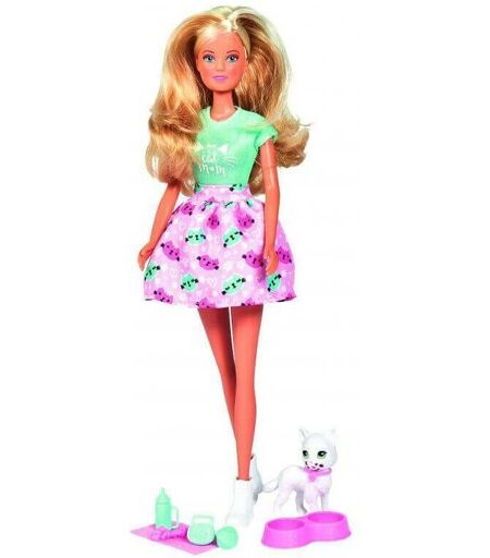 Une jolie poupée Steffi toujours aussi fashion et en compagnie de son adorable chaton ! Elle est habillée d'une ravissante tenue rose et turquoise à motifs chats. Elle s'accompagne également de multiples accessoires destinés au bien-être de son compagnon à moustaches : gamelles, panier, biberon, jeu... Découvrez une Steffi qui prendra le plus grand soin de son chaton ! Contenu : 1 poupée Steffi, 1 chaton et multiples accessoires Dimensions : 29 cm ...