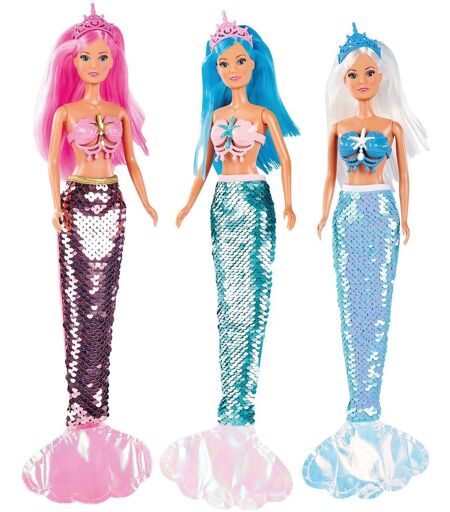 Retrouve ta poupée mannequin Steffi 29cm en tenue de sirene ! Sa nageoire caudale est recouverte de sequins pailletés réversibles : il te suffit de passer la main sur les sequins pour que la nageoire se transforme en une autre couleur ! Tu pourras également retirer sa nageoire pour l'habiller comme tu le souhaites ...