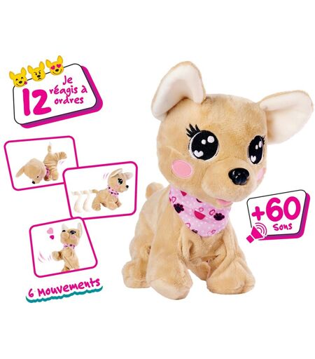 Une adorable peluche toute douce qui émet des sons comme un vrai petit chien. Un petit compagnon à quatre pattes qui réagit à 12 commandes vocales et qui peut émettre plus de 60 sons différents. Comme un vrai petit animal de compagnie, Chi Chi Love Baby Boo s'assoit, se couche, se lève sur les pattes arrière et les pattes avant, remue la queue et tourne sur lui-même ! Un jouet interactif idéal pour stimuler les enfants et leur apprendre à prendre soin d'un animal de compagnie. De quoi jouer pendant des heures avec son tendre et fidèle compagnon. Nécessite : 4 piles LR6 incluses ...