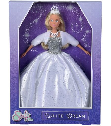Poupée mannequin Steffi 29cm. Steffi porte une robe blanche glamour à paillette, une tiare, un collier et une veste en fausse fourrure. ...